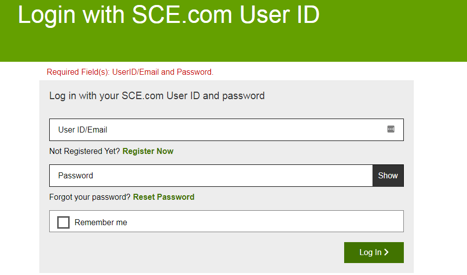 If you've forgotten your password, you can reset it by going to the reset your password page or clicking the "forget password?" link on the sce home page. Signing up has its benefits: Log in and pay with your checking account. Log in with your sce.com user . Save time, money, and the environment. Log in with your sce.com user id and password. Take control of your energy costs, check your usage data, and pay your bills . Turning on service at a new address? You may be eligible for a payment arrangement or other financial assistance. Turn on service for your home. Register to easily view and pay your bills, review your usage, sign up for notifications, and more. Register a new sce.com user id. First name, last name, email .